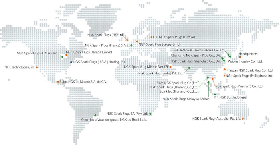 Бренды NGK и NTK стали символом надежности: мы поставляем нашим клиентам технологически совершенные свечи зажигания и свечи накаливания, а также другие сопутствующие товары самого высокого качества. Мы создали систему производства глобального масштаба, а также обширную мировую производственно-сбытовую сеть. В результате глобального развития бизнеса в настоящее время компания NGK SPARK PLUGS представлена в 21 стране по всему миру и поставляет продукцию, изготовленную в соответствии с самыми высокими стандартами качества.