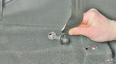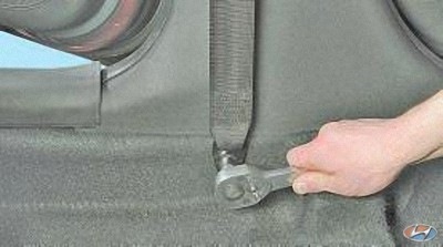 7. Для снятия верхней облицовки центральной стойки кузова выверните болт нижнего крепления переднего ремня безопасности и снимите болт.