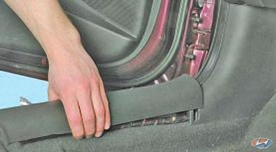 1. Для снятия верхней облицовки передней стойки кузова отсоедините уплотнитель передней двери от проема двери.