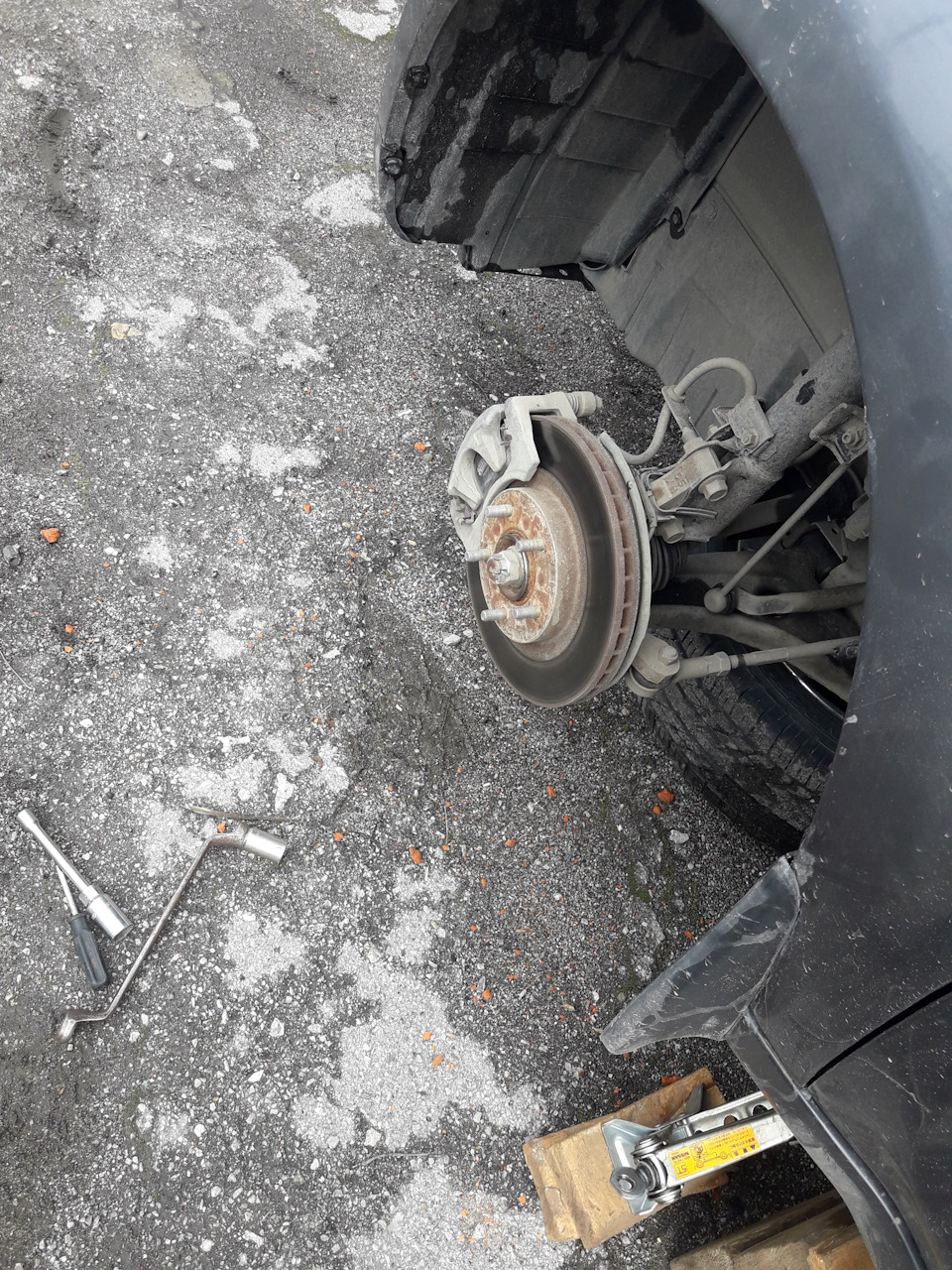 Домкратим машину, снимаем колесо. Машина при этом на ручнике.