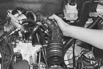 - Откручиваем хомуты шлангов обогрева дросселя и поднимаем их вверх, чтобы ОЖ не вытекала.