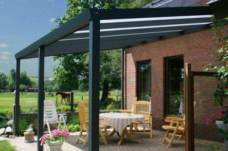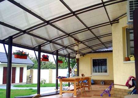 Каркас для пристройки обычно изготавливают из трубы стальной или бруса деревянного. Нередко, сооружают и из кирпича, камня, заливают цементные опоры. Выбор стройматериалов для сооружения, зависит от цели использования навеса, возможной нагрузки и от предпочтений хозяев. Если он пристраивается к дому жилому, то вплотную присоединяется к стене и на него попадает весь снег, сползающий с крыши. Следовательно, нужно обеспечить, достаточно крепкие опоры и перекрытия, чтобы они могли выдержать нагрузку, особенно весной, когда снег наиболее тяжелый. В качестве покрытия для крыши, используют профлист, шифер, железо оцинкованное, и все чаще, сотовый поликарбонат. Главными его достоинствами являются: