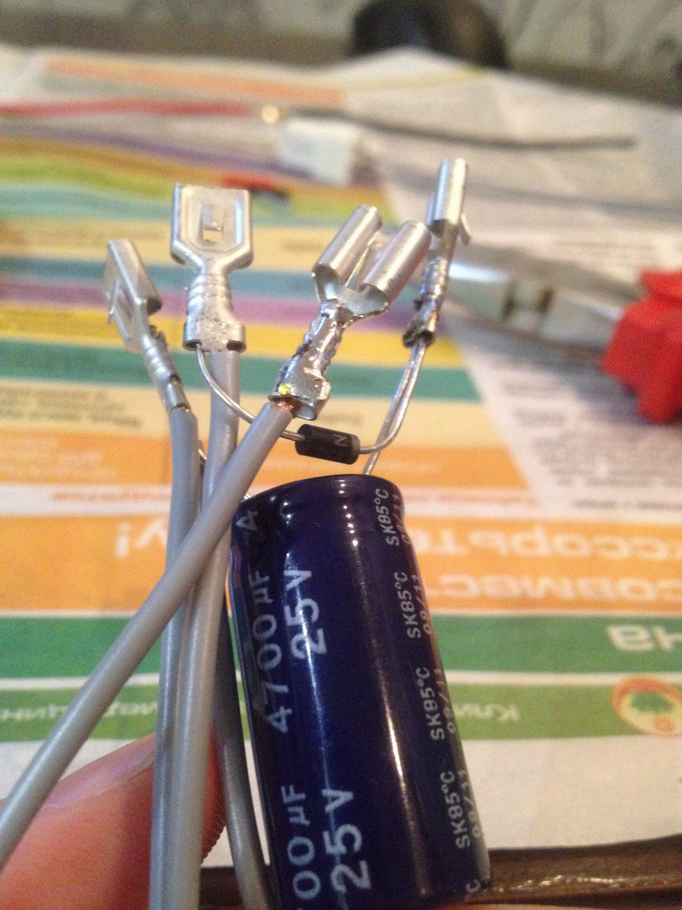 Этот способ, по сути, более правильный предыдущий. К пятиконтактому реле добавляются диод IN5819 и конденсатор на 25 вольт 4700 мф. Принцип работы тот же, но есть гарантия, что ничего, нигде не замкнет и прослужит долго без проблем.
