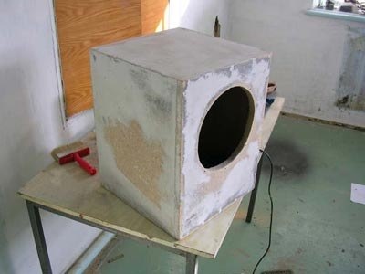 Изготовление начал с корпуса . Это самая пыльная часть работы. Не стал углубляться в теорию по всяким там вычислениям параметров Тиля-Смоля для динамика и программ для обсчета объема ящика. Просто прикинул приблизительные размеры на глаз и выпилил лобзиком заготовки из плит ДСП. Соединял саморезами. Все места соединений промазывал клеем ПВА. Ящик должен получиться практически герметичным. Если останутся большие щели, то ни о каком басе можно и не мечтать. Настраивал только длину трубы фазоинвертора по наилучшему звуку.