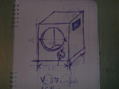 Расчитываем корпус сабвуфера. Скачиваем несколько программ для расчета корпусов сабвуферов — DLSBox2000, JBL-Speakershop, WinISD… Больше всего подошла прога DLSBox2000. С ее помощью и расчитываем саб. И вот что получается — эффективность данного оформления (ФИ) для нашего динамика составляет 76%, объем — 37 лиров (внешними размерами 45х35х35см.), фазоинвертор 75х100мм. (диаметр/длинна). Потом рисуем на бумаге эскиз, и начинаем его изготовление.