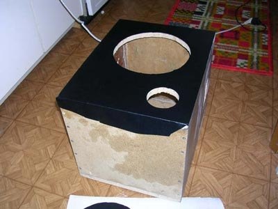 Через отверстие в крышке в корпус помещается карпет и фазоинвертор. Закрепляются на жидкие гвозди. С задней стороны крышка обклеивается шумоизолятором. Снаружи обклеивается карпетом.