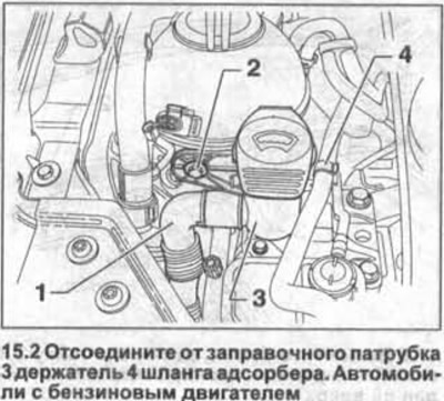 7. Снимите насос 4 омывателя, подав его вверх и высвободив из крепления на бачке (см. иллюстрацию 15.5).
