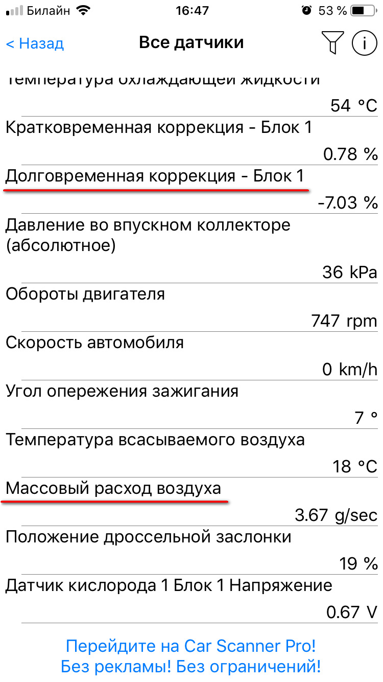 Все изменилось, когда после заливки нового ЧИПа мы с Shoorf решили сделать диагностику двигателя и посмотреть какие показатели нам выдаст ELM через программу Car Scaner. Сергей взглянул на показатели и сказал что с Долговременной коррекцией что-то не так (она была -15,6%). Ошибки появляются когда данный показатель находится в зоне -30 долгое время.
