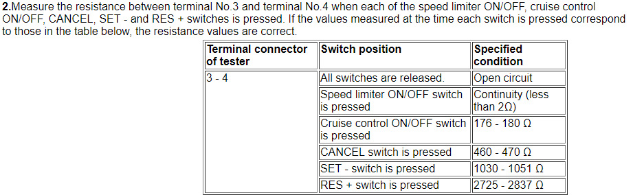 Разобрал. Снял кнопки круиза. Крутил-крутил. Мультиметром мерил. Понял, что они имеют неверные сопротивления. Т. е. схема правильная, а сопротивления — нет. Нашел в мануале для сервисменов такую табличку.