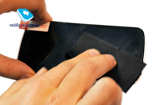Незамедлительно после очистки экрана разъединяем два слоя плёнки – основной и вспомогательный, освободившийся край плёнки прикладываем к устройству и, продолжая снимать вспомогательный слой, доклеиваем плёнку. При возникновении воздушных пузырей стоит воспользоваться прилагающейся карточкой.