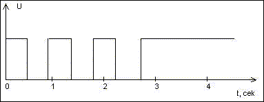 Предлагаемое устройство NM5403 служит для повышения безопасности движения и предназначено для предотвращения подобных ситуаций. Оно управляет лампами стоп-сигналов следующим образом: в момент начала торможения, то есть при нажатии на педаль тормоза, стоп-сигналы работают в импульсном режиме в течение некоторого времени, то есть происходит несколько вспышек ламп, а затем стоп-сигналы переходят в обычный режим непрерывного свечения. После усовершенствования схемы индикации торможения напряжение на лампах стоп-сигналов будет не постоянным, а импульсным, переходящим в постоянное, как показано на рис.1.