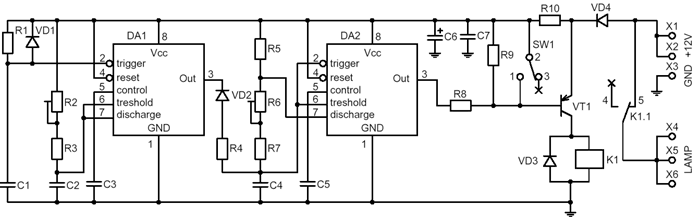 Устройство собрано на двух таймерах 555 (DA1 и DA2). Таймер DA1 включен по схеме одновибратора, а DA2 – по схеме мультивибратора. При подаче напряжения питания запускается мультивибратор DA2. Частота его импульсов, а, следовательно, частота вспышек ламп стоп-сигналов определяется элементами C4, R6 и R7. Подстроечным резистором R6 можно оперативно регулировать эту частоту. Одновременно с мультивибратором DA2 включается одновибратор DA1. Он вырабатывает одиночный импульс длительностью от 0,5 до 3 секунд. Длительность импульса зависит от элементов C2, R3 и R2. Её можно изменять при помощи подстроечного резистора R2. Одиночный импульс, вырабатываемый DA1, является запускающим для мультивибратора DA2. После окончания импульса на выходе 3 таймера DA1 появляется напряжение низкого уровня, которое через диод VD2 и резистор R4 поступает на времязадающий конденсатор C4 мультивибратора DA2 и принудительно устанавливает на нем напряжение, близкое к нулю, тем самым, запрещая дальнейшую выдачу импульсов на вывод 3 таймера DA2. Импульсы с выхода 3 таймера DA2 через резисторы R8 и R9 поступают на транзистор VT1, нагрузкой которого является реле К1. Коммутация сигнальных ламп осуществляется нормально замкнутыми контактами реле. Элементы R1, C1 и VD1 необходимы для быстрого перезапуска таймера DA1.