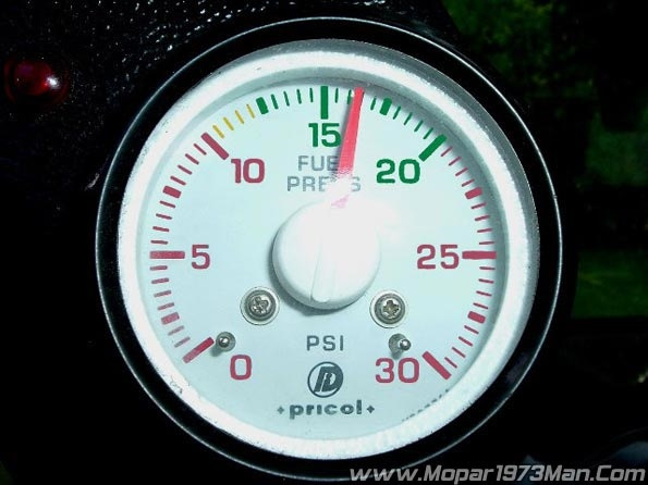 Нормальное давление топлива должно быть 14-15 PSI (0.96-1 бар) . никогда не ниже 10 PSI на всех режимах. Вот так раскрашен манометр топлива так, чтобы дать вам диапазон давления топлива . Нужно, чтобы стрелка приборки оставaлась в зеленой зоне во все времена. Желтая зона является предупреждением, вы должны проверить топливный фильтр, производительность насоa, перепускной клапана и т.д.