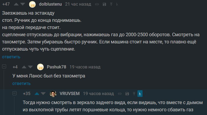 Да и тахометр реально не так уж и нужно смотреть. Я лично для себя уже к концу обучения в автошколе перестал, т.к. все спокойно определялось слухом и жопой(вибрации), больше внимания уделял зеркалам)
