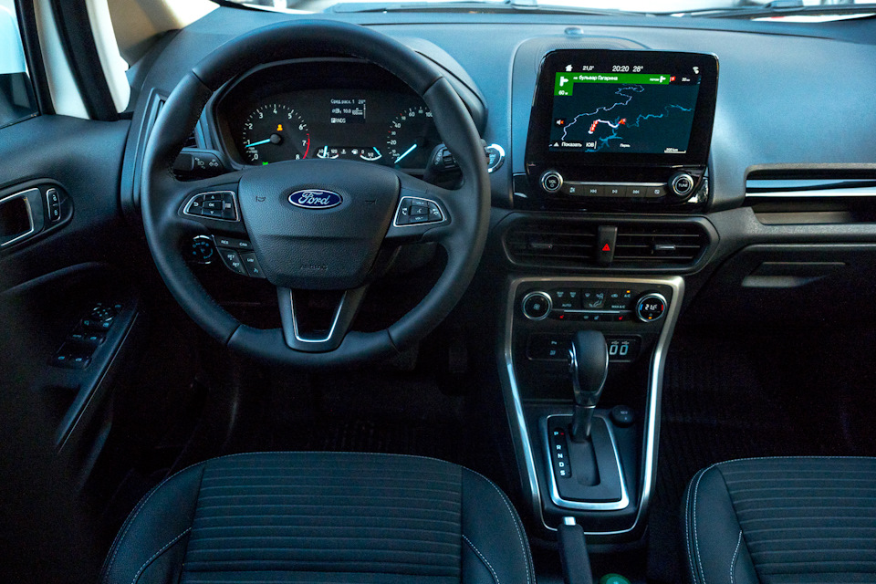 Ford EcoSport имеют 4,5-литровый бачок омывающей жидкости, веерные форсунки омывателя с подогревом, русифицированную навигацию и дополнительный USB-разъем в потолочной консоли для подключения, например, видеорегистратора. Кроме того, все моторы могут работать на 92-м бензине.