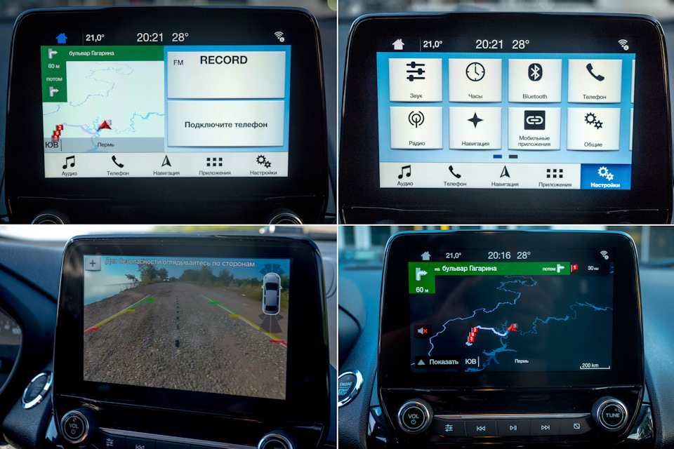 На центральной панели — фирменный пульт мультимедийной системы SYNC. Правда, дисплей у нее монохромный, простенький, но и здесь есть логичное объяснение: он всегда четко виден и не бликует даже под прямыми солнечными лучами. Ну а функционал у этого “калькулятора” очень неплох: есть bluetooth с профилем A2DP, есть голосовое управление, понимающее русский язык и способное даже зачитывать входящие СМС, меню простое, как в старых мобильниках — удобно и понятно. Хотя в той же Европе SYNC поставляется с Wi-Fi-роутером и нормальным цветным дисплеем. Но у российской версии есть огромный плюс, она доступна за небольшие деньги — около 10 тысяч рублей. Кроме того, звук стерео здесь — на зависть многим более дорогим аналогам: глубокий, уверенный бас, хорошая детализация. Неожиданно!