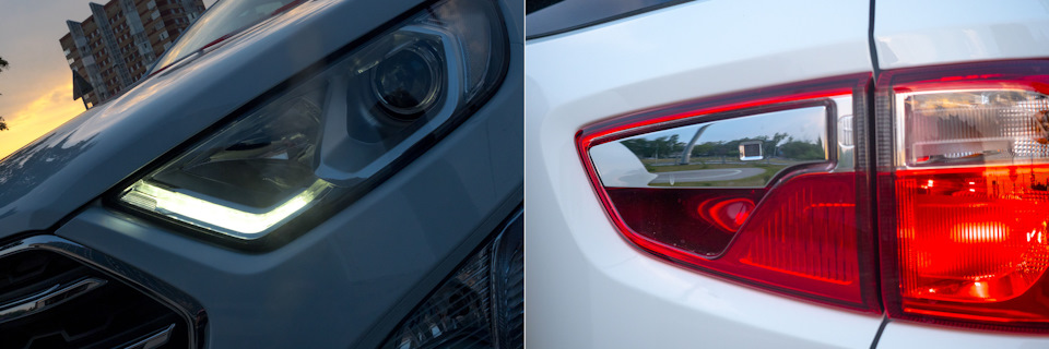 В галогеновые фары встроены светодиодные контуры, но они такие тонкие, что их почти не видно. В сумерках — очень эффектно, однако в качестве ходовых огней днем их использовать вряд ли получится. Колеса маленькие — 205/60 R16, и в этом есть плюс — размерность популярная, резина недорогая. Так что пока всё чин чином.