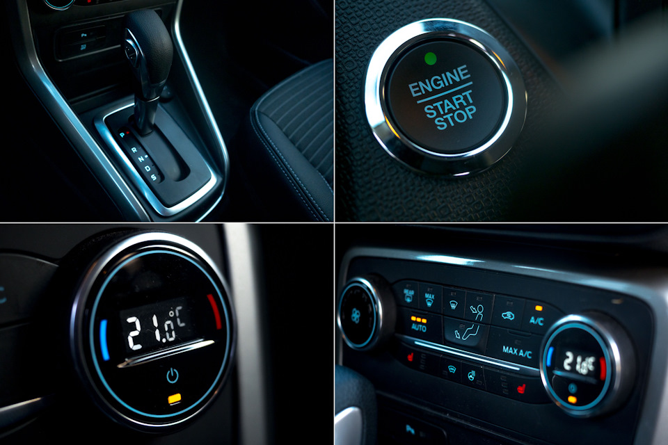 По центру возвышается цветной дисплей медиасистемы: у базовых версий — скромная «музыка» с экраном диагональю 4,2 дюйма, а у машин подороже — продвинутый комплекс Sync 3 с дисплеем 6,5 или 8,0 дюйма. Среди опций есть ксеноновые фары, круиз-контроль с ограничителем скорости, обогрев руля, камера заднего вида и система контроля слепых зон.