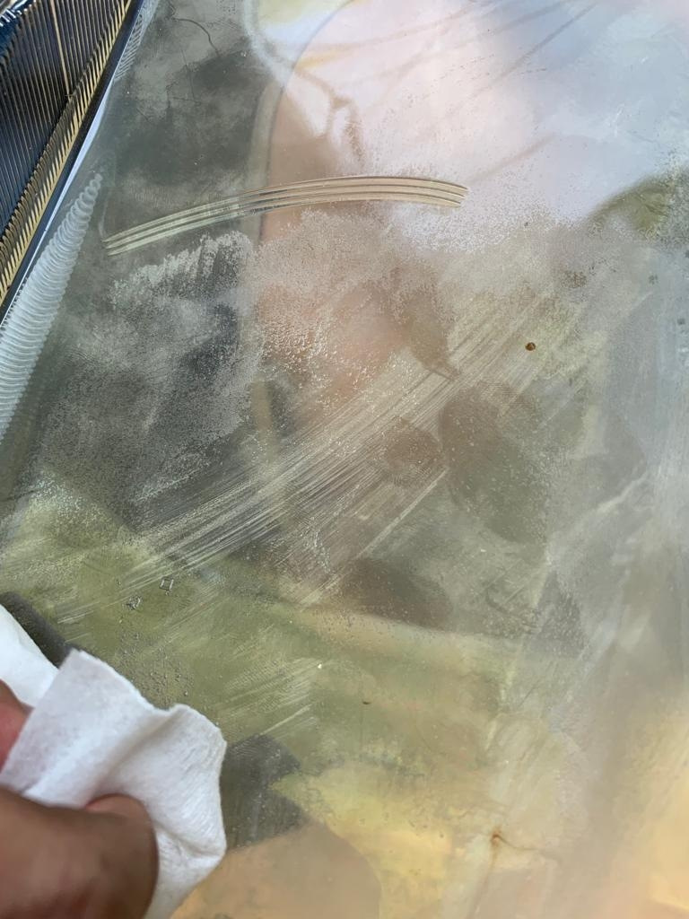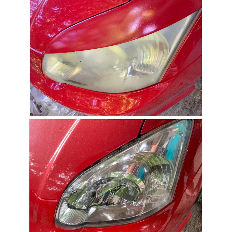 Стал искать инструкцию по применению и понял что полный голяк, китайцы через корявый перевод пишут что затираем намокро 400-600-800 и наносим состав. Я решил что это чересчур и затер 1000 потом 2000. Год назад в фары вставлялись линзы и соответственно полировались. К сожалению фоток не осталось, но даже после полировки фары выглядели так себе, левая осталась с желтизной, как сказали “Профессионалы” что ничего не сделать. Осталось менять стекло. Ну и через три месяца фары были мутные.