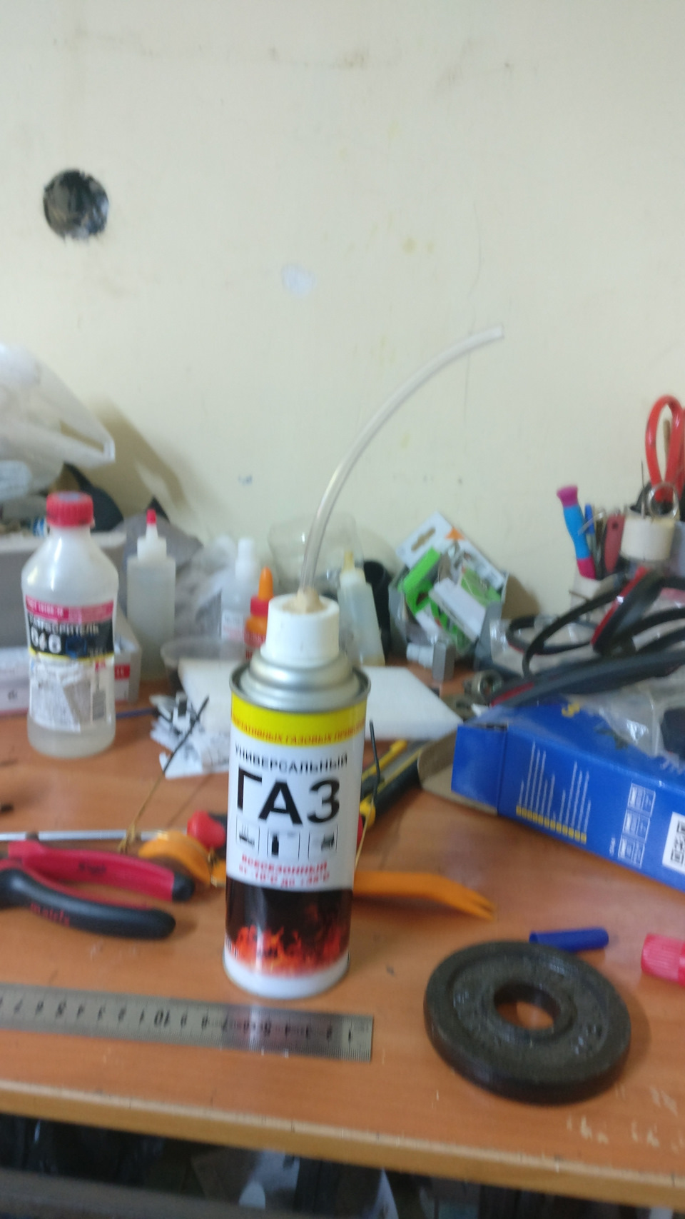 Уже тогда фары были откровенно говоря в неприглядном виде. А в последнее время фары были уже просто в ужасе)) долго я ходил кругами вокруг них и все не знал как поступить. Думал просто полировать. Потом думал полировать и покрывать лаком. Но опасался что руки, как говорится, растут не совсем откуда должны и что фары запорю окончательно. Уже был готов пробить брешь в семейном бюджете и прикупить хотя бы заменители Depo. В итоге сначала решил попробовать “на кошках”, вернее на поликорбонатной стенке беседки хтмощный способ восстановления “паром”. Соорудил ёмкость из газового балончика с выводом трубки для парения.