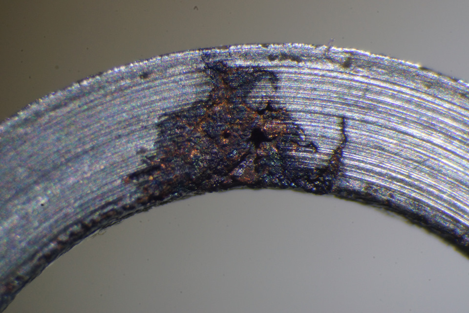 С чем связан данный эффект остается только гадать! Однако винить дизельное топливо не имеется ни какого смысла, так как деталь повреждена только в едином (точечном месте). Если приглядеться, то можно увидеть следы коррозии на верхней части кольца обратки.